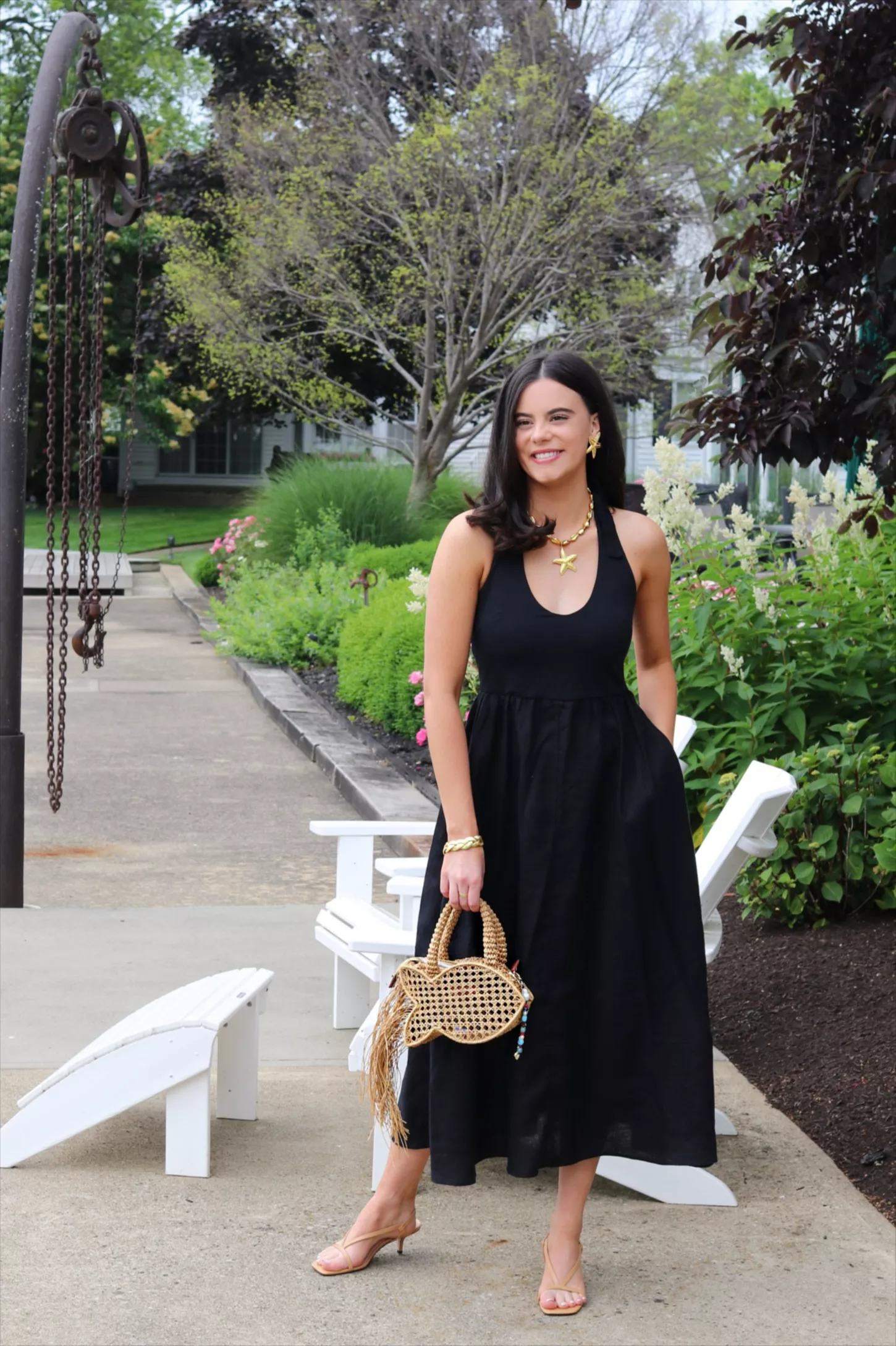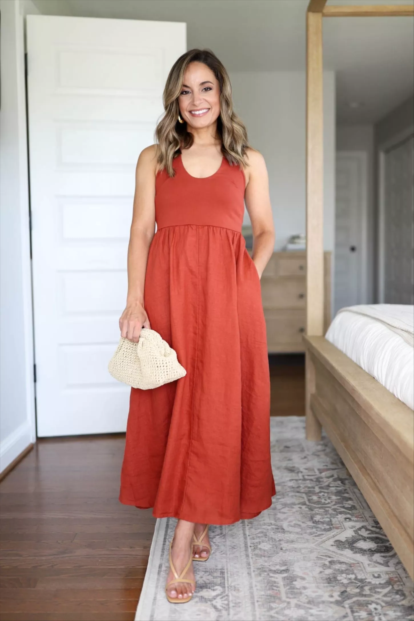 It's crafted with a stretchy cotton blend on top and breezy linen on the bottom, in a halter silhouette that's perfect for summer. Plus, it has pockets!