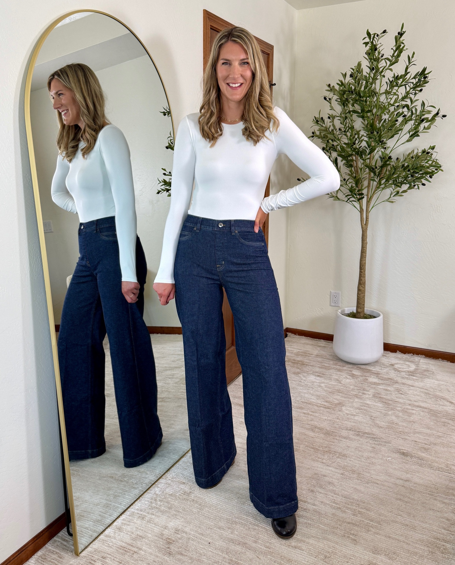 Plus, with a wide leg and high waist, these jeans elongate your leg and celebrate your figure. All you have to do is pull these on: faux buttons and no zippers (so no bulk!). This is denim done right.